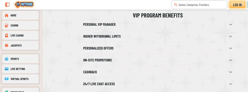Wyns has gone big on the game count. The library runs over 8,000 games from more than 73 providers. There are +7,700 slots, a full live casino, instant games and RNG table games. You name it. We took Mega Moolah and Sweet Bonanza "out for a spin" when playing at the site.